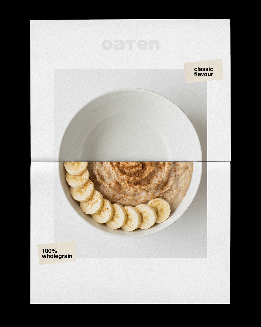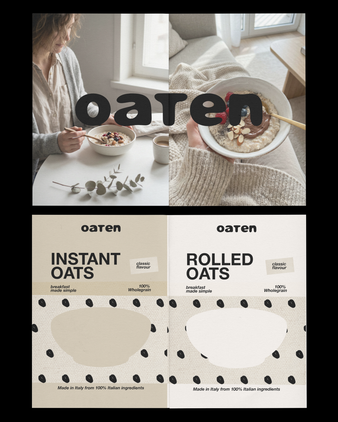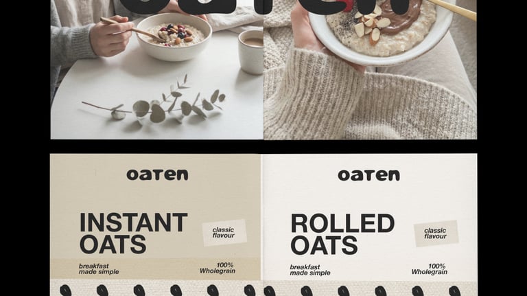 I designed the visual identity for Oaten, an oat and porridge brand created with a clear purpose: turning breakfast into a simple, natural, and contemporary ritual.